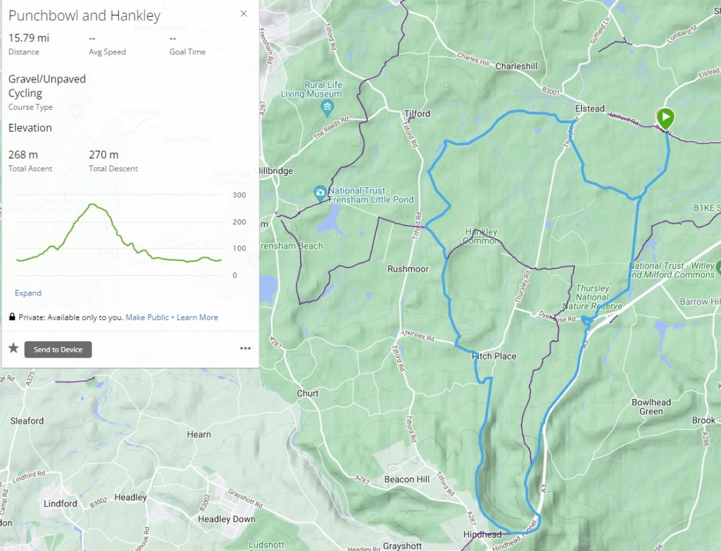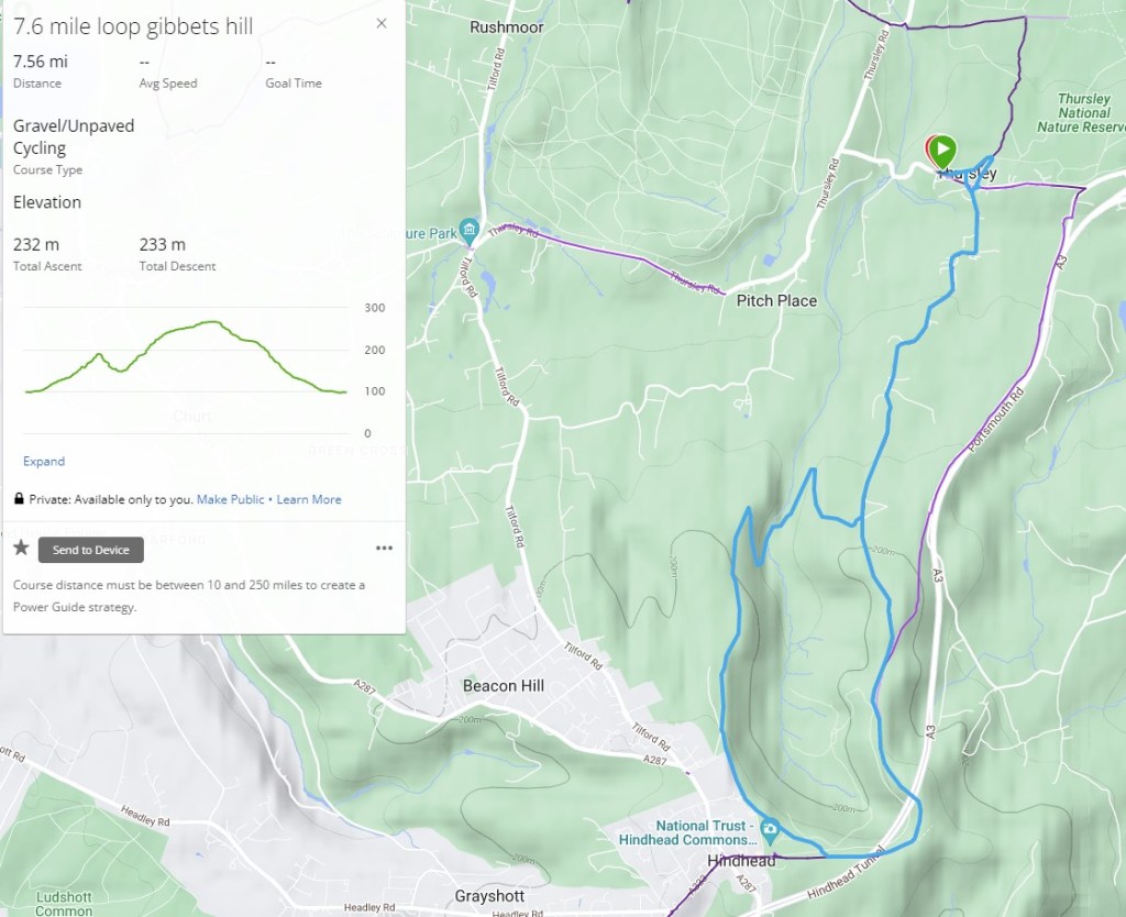 Climb from Thursley up to Gibbets hill and circle the punchbowl to return. Stop at the NT cafe en-route.