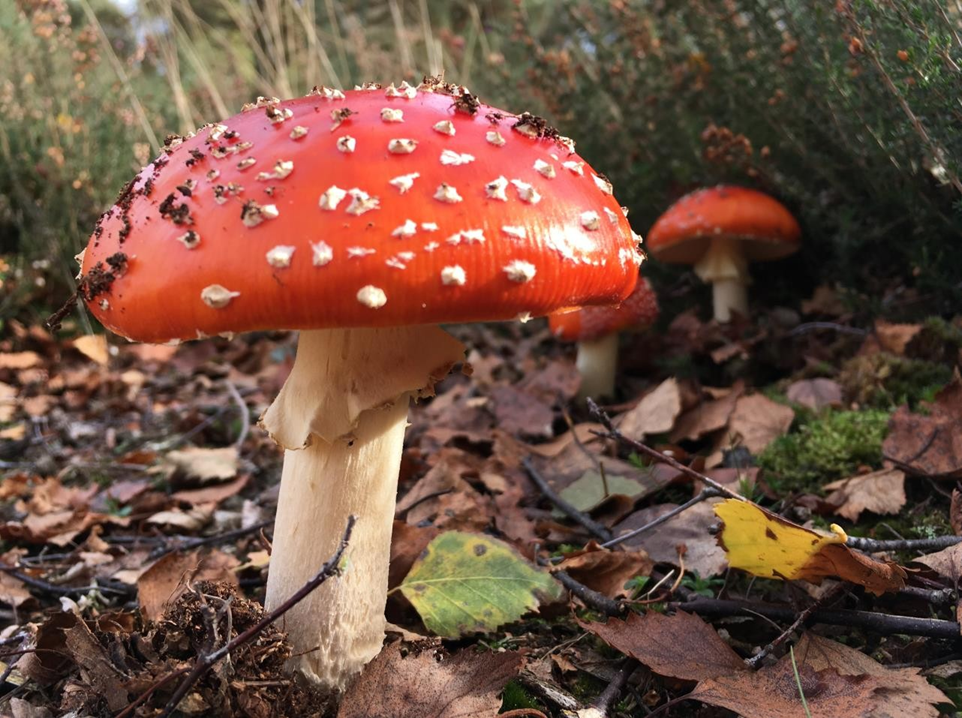 Take the remarkably familiar fly agaric (amanita muscaria) toadstools a familiar sight on many heathlands, so bright and colourful, so synonymous with toadstools in general. Of many a myth and legend, those warning colours of red and white. Stories of faeries, and magic, abound in many northern European folk tales -think about if you say toadstools which mushroom comes to mind firstly and foremostly. Eaten with impunity by many of our smaller mammals, and larger mammals to that point, but not for not for us.